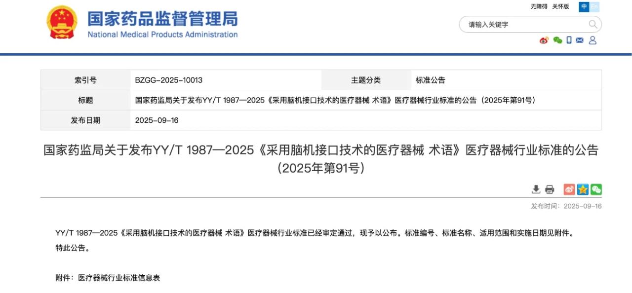 近日,国家药监局批准发布了YY/T 1987—2025《采用脑机接口技术的医疗器械 术语》医疗器械行业标准。这是我国第一项脑机接口医疗器械标准,为脑机接口医疗器械产业高质量发展奠定基础。
