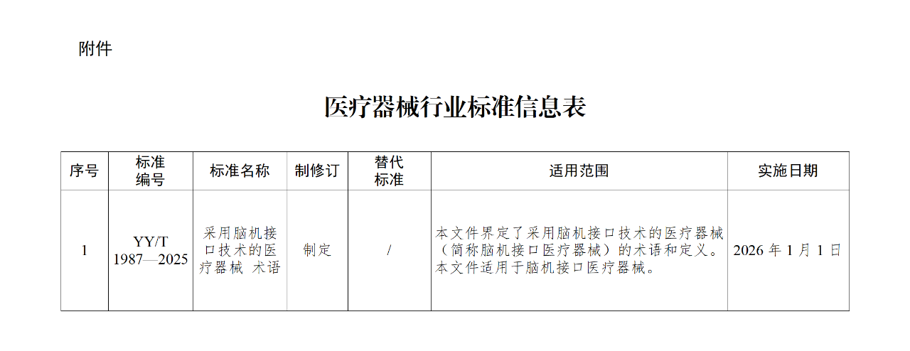 YY/T 1987—2025《采用脑机接口技术的医疗器械 术语》医疗器械行业标准已经审定通过,现予以公布。标准编号、标准名称、适用范围和实施日期见附件。
